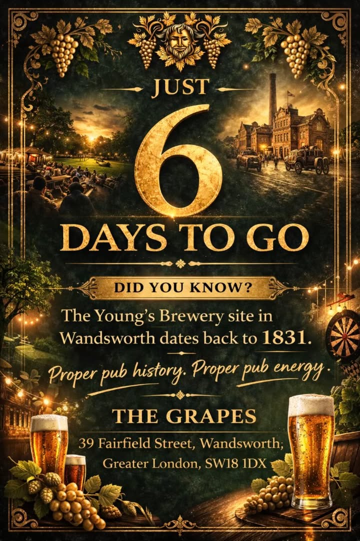 JUST 5 DAYS TO GO… 🍇 The countdown is well and truly on. In just five days’ time, the doors of The Grapes, Wandsworth swing open once again and we cannot wait to welcome you in. From perfectly poured pints 🍺 to live sport on the screens, a cracking game of darts 🎯 or pool 🎱, and that unbeatable local pub atmosphere — we’re bringing The Grapes back to life. And here’s a little Wandsworth fact for the day… Did you know Wandsworth Prison is one of the largest prisons in Europe? Don’t worry though… there’s no need to escape, just escape to the pub instead. 👀 📍 Friends & Family Opening: Thursday 12 March 🎉 Official Opening: Friday 13 March (from 12 noon) 🎶 Live Music: Soul Immigrants — Saturday 14 March from 8pm Great drinks. Great sport. Great people. The Grapes is back. 📍 39 Fairfield Street, Wandsworth, SW18 #TheGrapes #Wandsworth #UnitySocial #LocalPub #OpeningSoon